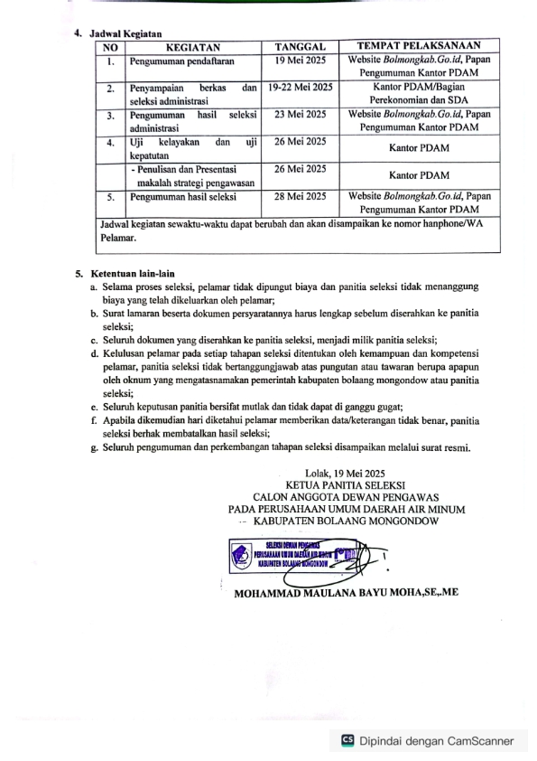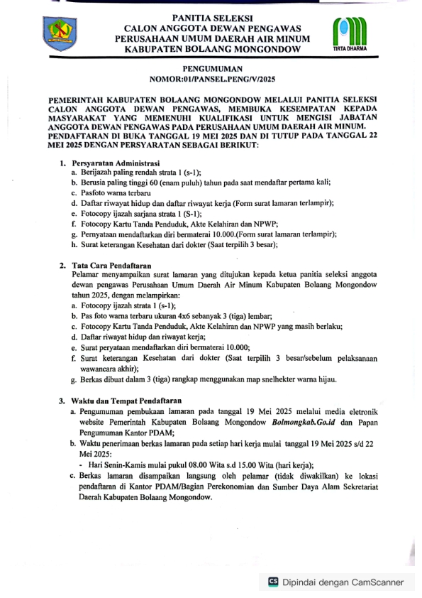 Pengumuman Seleksi Calon Anggota Dewan Pengawas Perusahaan Umum Daerah Air Minum Kabupaten Bolaang Mongondow dapat di uduh di tautan berikut ini :
