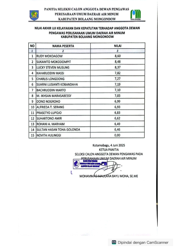 Pengumuman Nilai Akhir Ujian Kelayakan dan Kepatutan terhadap Anggota Dewan Pengawas Perusahaan Umum Daerah Air Minum Kabupaten Bolaang Mongondow