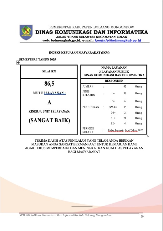 Beranda Rilis Berita Indeks Kepuasan Masyarakat (IKM) Rilis Berita Indeks Kepuasan Masyarakat (IKM) Oleh Administrator - 28 September 2025 117 Facebook Twitter WhatsApp Telegram Indeks Kepuasan Masyarakat (IKM) 3 Layanan Publik Dinas Komunikasi dan Informatika Kabupaten Bolaang Mongondow